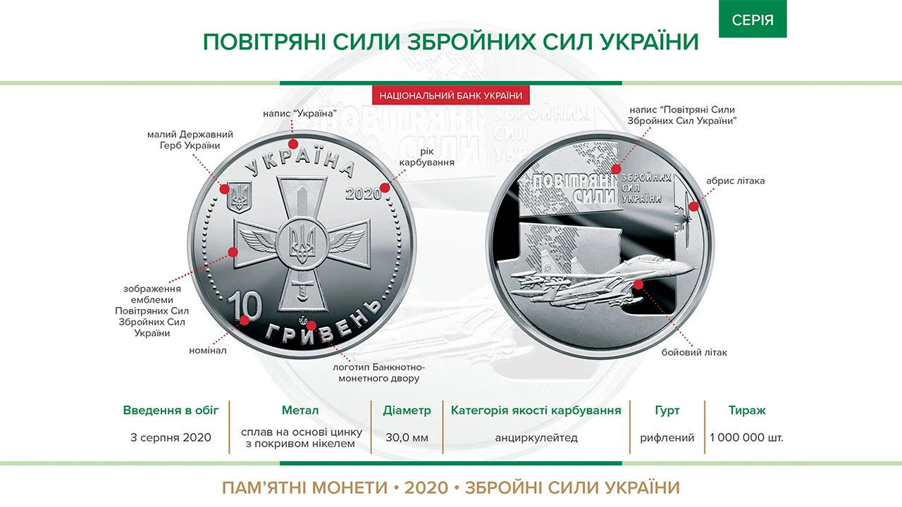 Пам'ятна монета "Повітряні Сили Збройних Сил України" вводиться в обіг з 03 серпня 2020 року