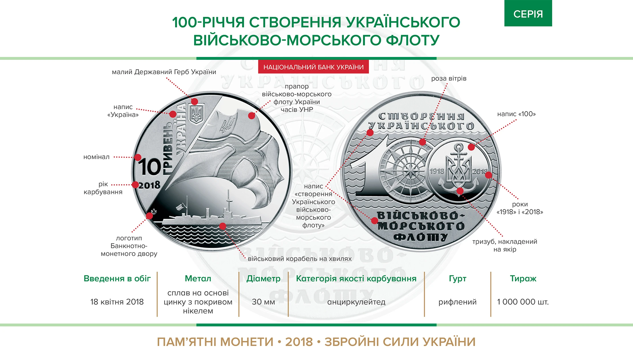Пам'ятні та ювілейні монети, які випускають НБУ, зазвичай з дорогоцінних металів. Усього три 10-гривневі монети викарбувано з цинкового сплаву. Монета «100-річчя створення Українського військово-морського флоту» була випущена в обіг у 2018 році, другою «неблагородною» у серії, тиражем у 1 млн екземплярів. Її вага складає 12,4 грама при діаметрі 30 мм.